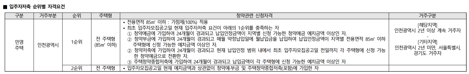 입주자모집공고일 현재 주택건설지역(인천광역시)에 거주하거나 서울특별시 및 경기도 지역에 거주하는 만19세 이상인 자 또는 세대주인 미성년자(자녀양육, 형제자매부양) 중 입주자저축 순위별 자격요건을 갖춘 자(국내에서 거주하는 재외동포 재외국민 외국국적 동포 및 외국인 포함)를 대상으로 주택형별 청약순위 별로 청약 접수가 가능함.