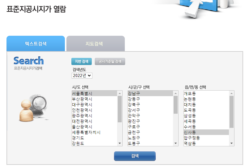 내가 알고싶은 지역의 시/도,군,읍/면/동을 선택하시면 표준지공시지가를 바로 보실 수 있습니다.