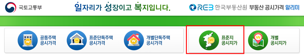 들어가셔서 상단 왼쪽에 보이는 표준지공시지가를 클릭해주세요.