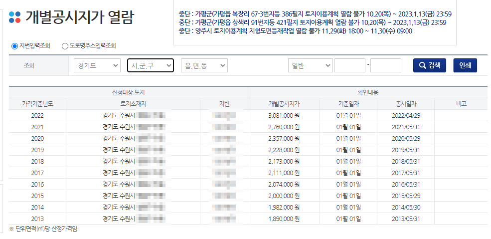 해당 사이트에 들어가셔서 주소를 입력한 후 검색을 하시면 아래와 같이 개별공시지가를 확인할 수 있습니다.
