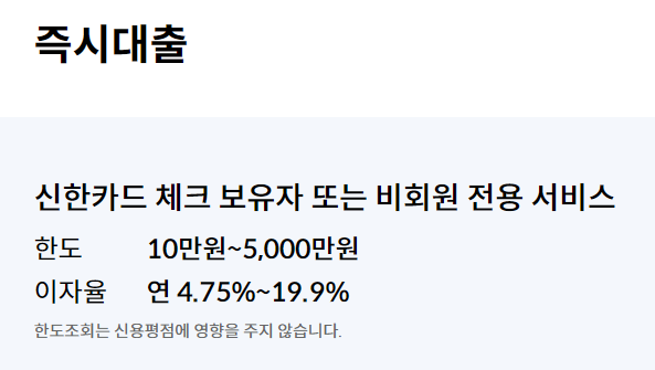신한카드 즉시대출 한도 및 금리