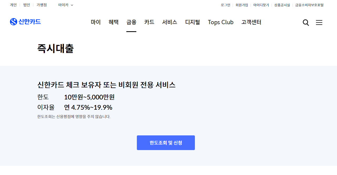 신한카드 즉시대출을 신청하시려는 분들은 한도조회 및 신청 버튼을 클릭해주세요.