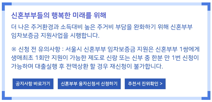 서울시에서 주거마련에 대한 부담 증가로 혼인수가 감소하고 있고, 혼인을 하더라도 열악한 주거환경 등으로 인한 출산기피 현상을 해결하고자 시행하는 서울시 사업으로 대출자격의 소득 수준이 부부합산 9,700만원으로 높습니다. 대출한도는 최대 2억, 금리는 은행별 상이하긴 하지만 시중 은행의 대출 금리보다는 낮은 편입니다. 취급은행으로는 하나은행, 신한은행, 국민은행이 있습니다.