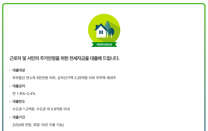 대출한도 : 수도권 3억원, 그 외 2억원까지(임차보증금의 80% 이내)