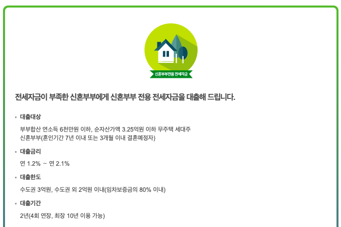 대출자격 : 연 소득 부부 합산소득 6,000만원 이하, 순자산액 3억2,500만원 이하, 신혼부부(혼인기간 7년 이내 또는 3개월 이내 결혼예정자)
