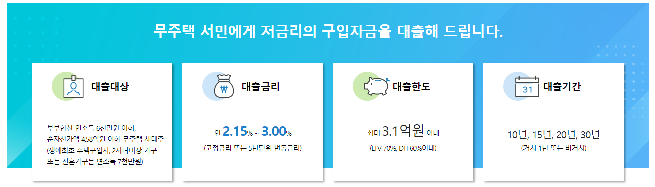 부부합산 연소득 6천만원 이하. 순자산가액 4.58억원 이하 무주택 세애주(생애최초 주택구입자, 2자녀이상 가구 또는 신혼가구는 연소득 7천만원)