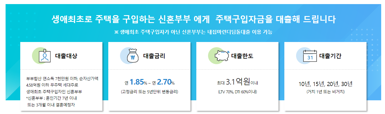 부부합산 연소득 7,000만원 이하. 순자산가액 4억5,800만원 이하 무주택 세대주로 생애최초 주택구입자인 신혼부부(혼인기간 7년 이내 또는 3개월 이내 결혼예정자)