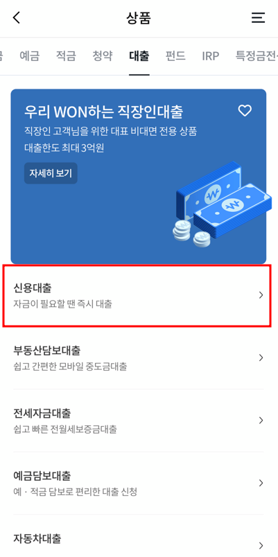 2. 빨간 네모칸에 보이는 '대출' 클릭