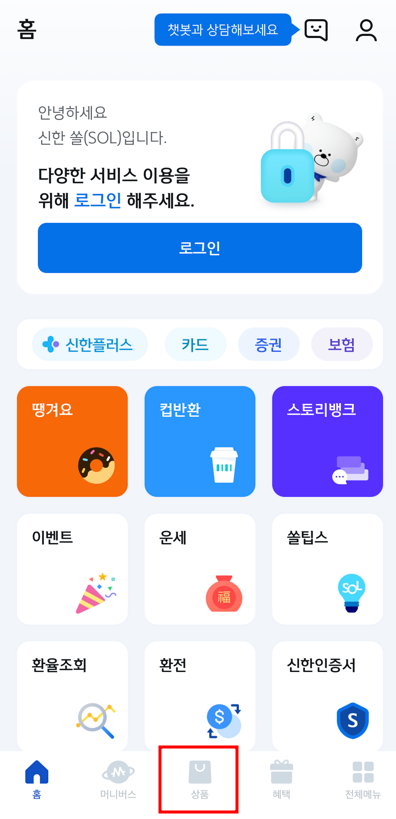 1. 신한 쏠(SOL) 어플을 실행시킨 후 하단에 보이는 '상품'을 클릭해주세요.