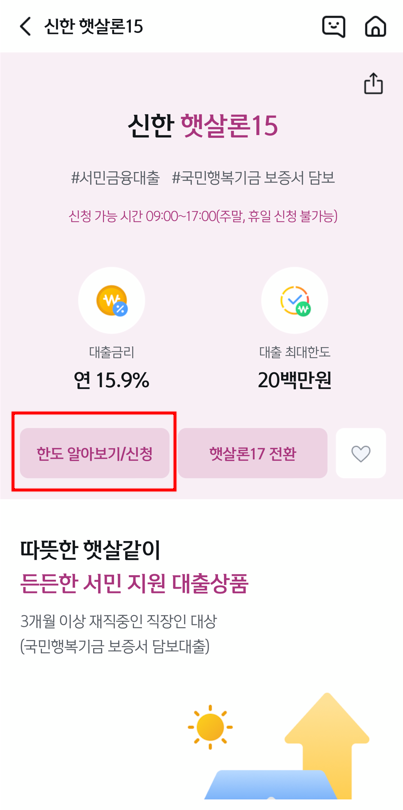 4. 신한 햇살란15의 한도 알아보기/ 신청 버튼을 클릭하시면 쉽게 신청이 가능합니다.