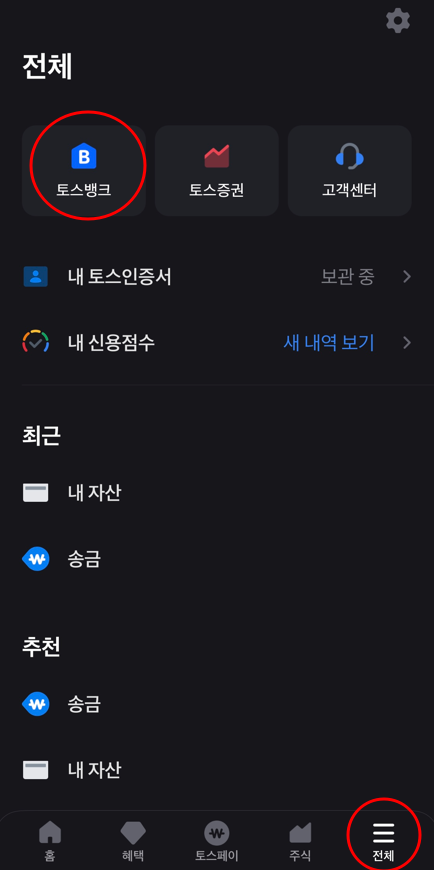 1. 토스 앱을 다운 받으셨다면, 앱을 실행시킨 후 하단에 보이는 전체 버튼을 누르고, 토스뱅크를 터치하세요