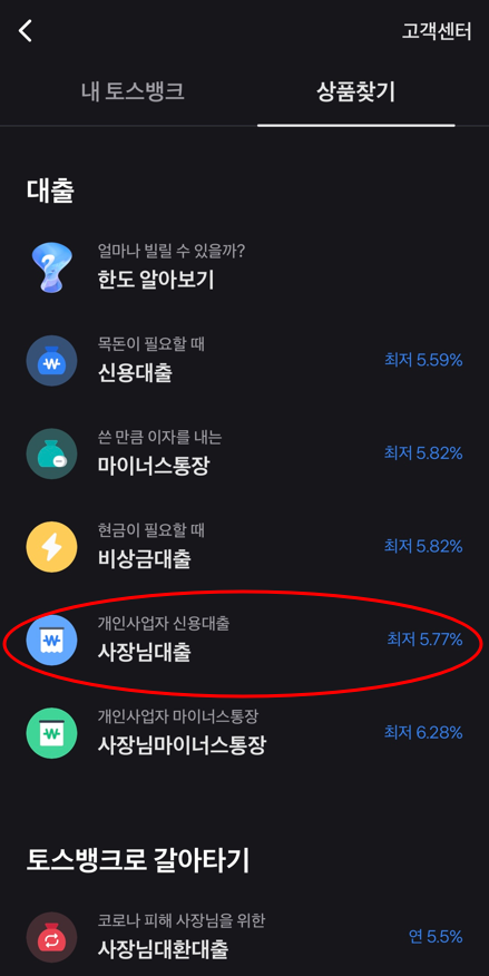 2. '상품찾기'에서 대출 상품 중 사장님대출을 터치 해주세요.