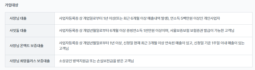 - 사장님대출 : 사업자등록증 상 개업일로부터 1년 이상(또는 최근 6개우러 이상 매출내역 발생), 연소득 500만원 이상인 개인사업자