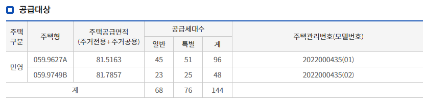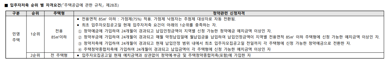- 전용면적 85㎡이하 세대 : 가점제(75%) 적용, 가점제 낙첨자는 추첨제 대상으로 자동 전환됨.