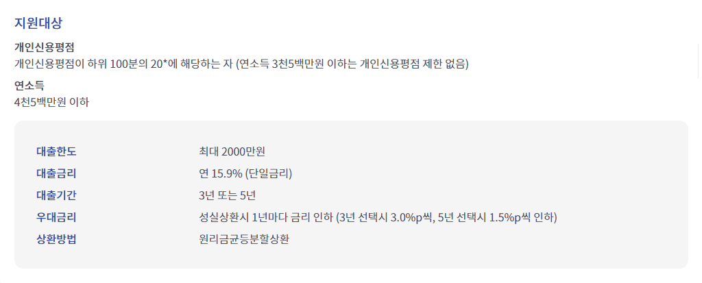 신청 조건으로는 연간 수입 3500만 원 이하 혹은 연간 수입 4500만 원 이하면서 신용평점 하위 20% 이하