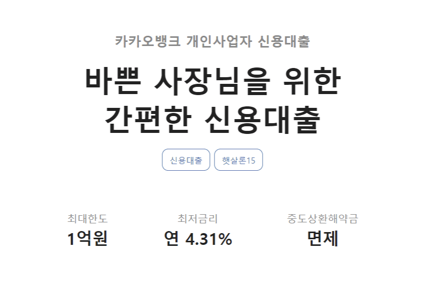개인사업자들을 위한 제 1금융권 대출은 대부분 상품이 괜찮은 편인데요. 그중에서도 가장 신청 방법이 간단해서 카카오뱅크 개인사업자 대출 소개드릴게요.