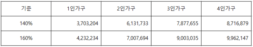 전년도 도시근로자 가구당 월평균 소득의 140%(배우자가 소득이 있는 경우에는 160%) 이하