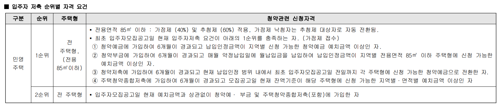 - 전용면적 85㎡이하 세대 : 가점제(40%) 및 추첨제(60%) 적용, 가점제 낙첨자는 추첨제 대상자로 자동 전환됨.