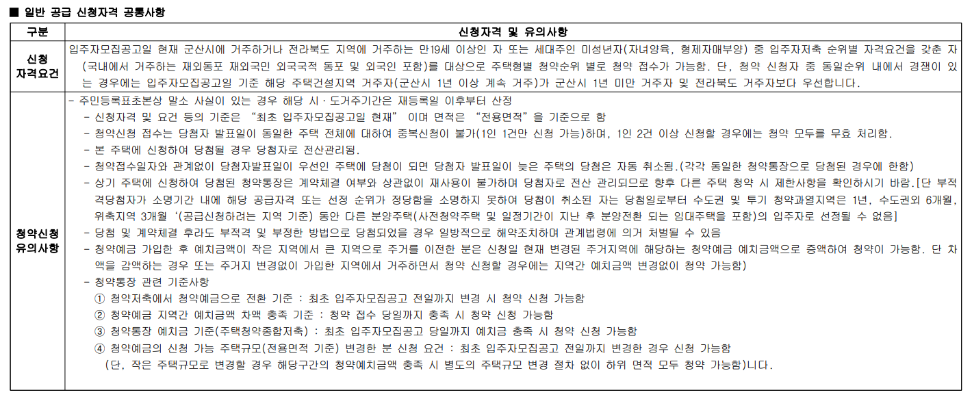 입주자모집공고일 현재 군산시에 거주하거나 전라북도 지역에 거주하는 만 19세 이상인 자 또는 세대주인 미성년자(자녀양육, 형제자매부양) 중 입주자저축 순위별 자격요건을 갖춘 자(국내에서 거주하는 재외동포 재외국민 외국국적 동포 및 외국인 포함)를 대상으로 주택형별 청약순위 별로 청약 접수가 가능함. 단, 청약 신청자 중 동일순위 내에서 경쟁이 있는 경우에는 입주자모집공고일 기준 해당 주택건설지역 거주자(군산시 1년 이상 계속 거주)가 군산시 1년 미만 거주자 및 전라북도 거주자보다 우선합니다.