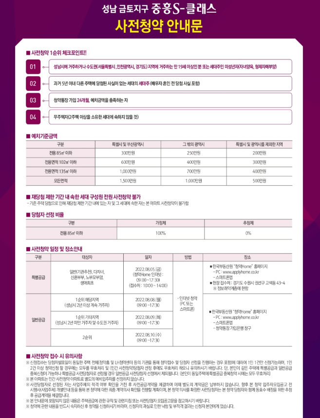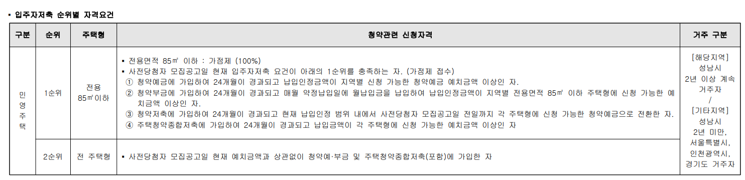 사전당첨자 모집공고일 현재 성남시에 거주하거나 서울특별시, 인천광역시, 경기도 지역에 거주하는 만 19세 이상인 자 또는 세대(자녀양육, 형제자매부양) 중 입주자저축 순위별 자격요건을 갖춘 자(국내에서 거주하는 재외동포 재외국민 외국국적 동포 및 외국인 포함)를 대상으로 주택형별 청약순위 별로 청약 접수가 가능함.