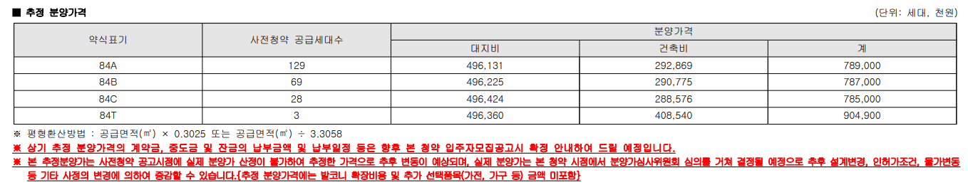자세한 층별 세대별 분양가는 밝혀지지 않았습니다. 다만 84A, 84B, 84C, 84T 형별 분양가(최고가)만 위 금액으로 추정하고 있습니다.