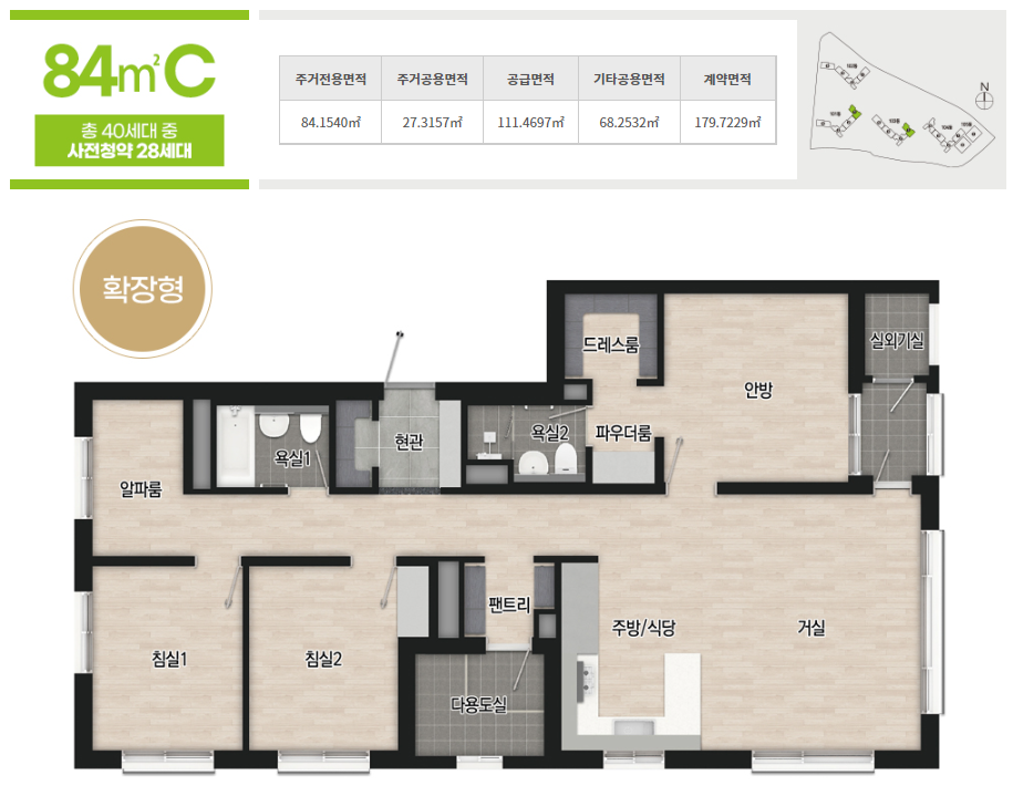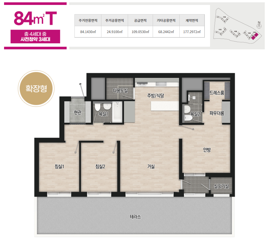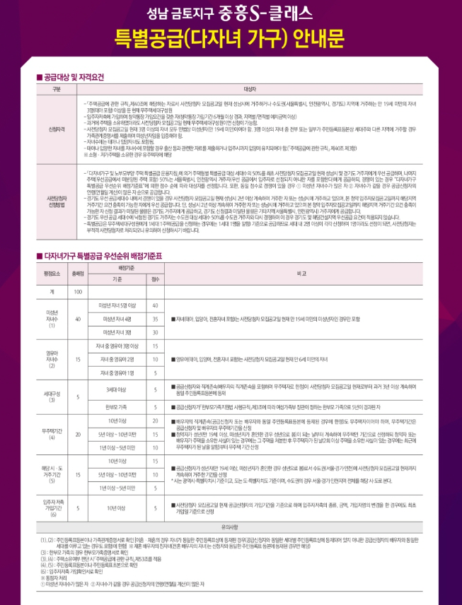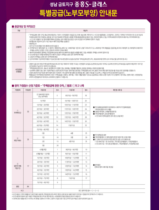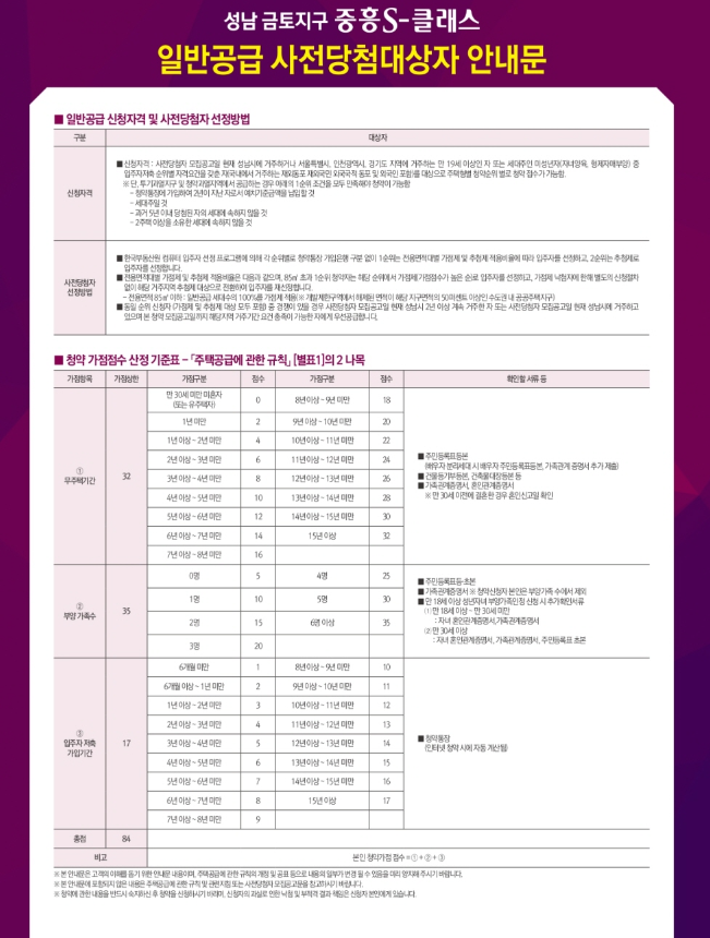 - 전용면적 85㎡이하 세대 : 가점제(100%) 적용