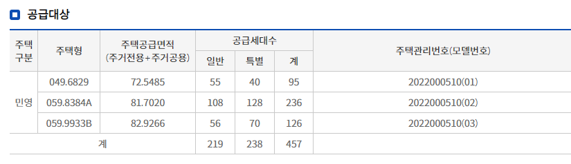 - 전용면적 85㎡이하 세대 : 무주택가점제(75%) / 추첨제(25%) 가점제 낙첨자는 추첨제 대상자로 자동 전환됩니다.