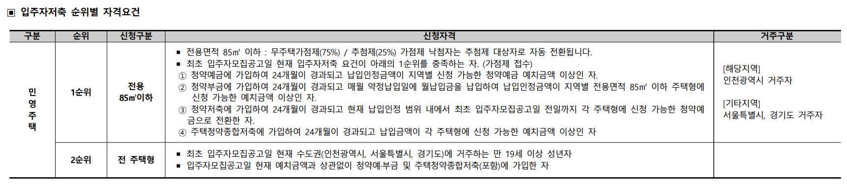 입주자모집공고일 현재 인천광역시에 거주하거나, 수도권(서울특별시, 경기도) 지역에 거주하는 만 19세 이상인 자 중 또는 세대주인 미성년자(자녀양육, 형제자매부양) 중 입주자저축 순위별 자격요건을 갖춘 자(국내에 거주하고 있는 재외동포 재외국민, 외국국적 동포 및 외국인 포함)를 대상으로 주택형별 청약순위 별로 청약 접수가 가능합니다.