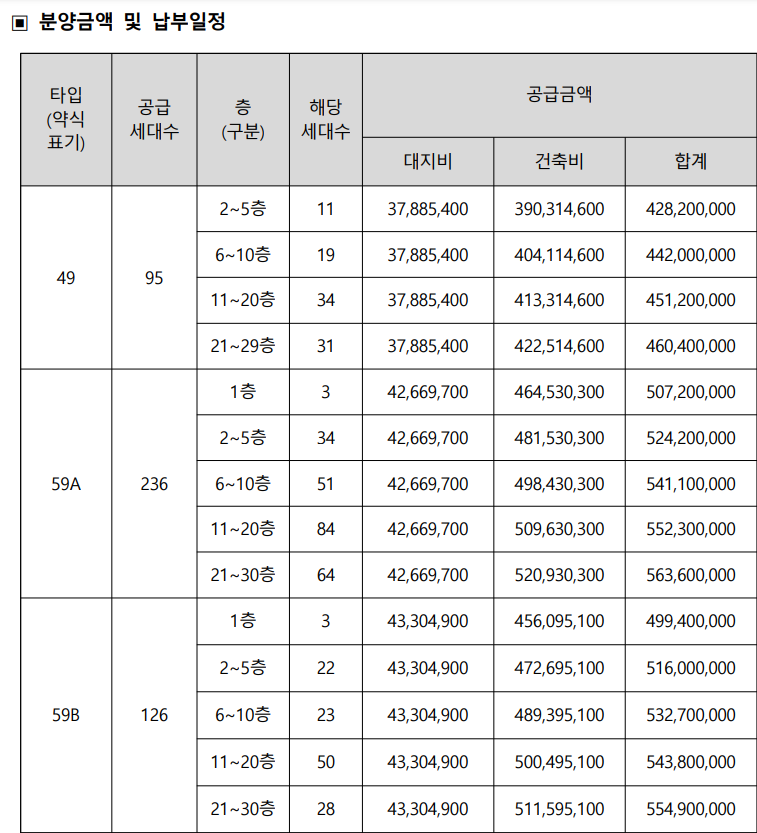 | 주택형 타입 | 공급금액(최고가 기준) |