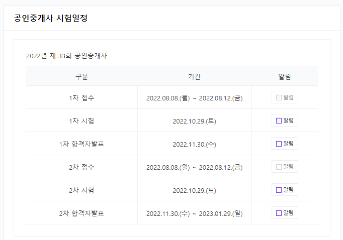 올해 공인중개사 시험일정은 위 사진과 같습니다. 시험접수는 8월에 한 후 시험을 10월말에 치르게 되는 일정입니다. 매년 공인중개사 시험은 8월 접수 후 10월 시험이기 때문에 올해 시험이 어려우신 분들은 내년을 준비하시면 됩니다.