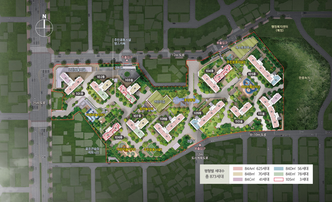 | 세대수 | 총 873세대 및 부대복리시설 | 연면적 | 152,260.6994㎡ |