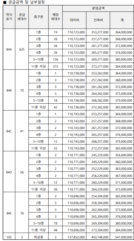 해당 표의 분양가는 평형별 최고가이므로, 자세한 층별 평형별 분양가는 위에 사진을 참고해주세요