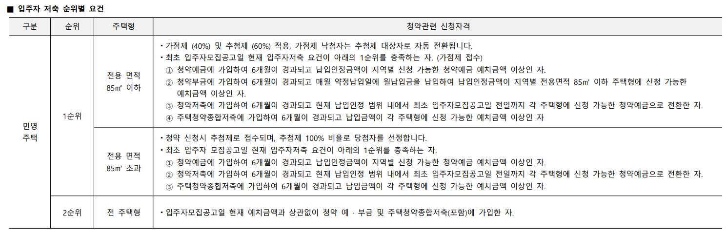 - 전용면적 85㎡이하 세대 : 가점제(40%) 및 추첮메(60%) 적용, 낙첨자는 추첨제 대상자로 자동 전환됩니다.