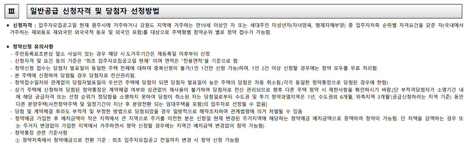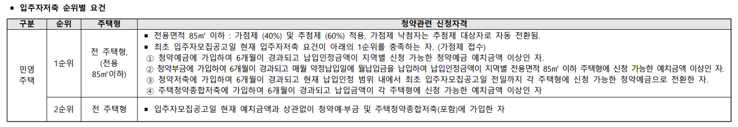 - 전용면적 85㎡이하 세대 : 가점제(40%) 적용 및 추첨제(60%) 적용, 가점제 낙첨자는 추첨제 대상자로 자동 전환됩니다.