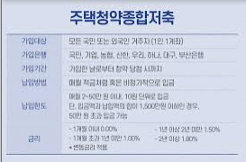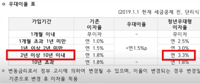 가입 기간 1개월 초과~1년 미만은 연 2.5%이고 1년 이상~2년 미만은 3%의 금리를 적용하며, 가입일로부터 2년 이상 10년 이내 유지한 계좌만 납부금액 5천만원까지 연 최대 3.3%의 우대 금리를 적용합니다. 청년 우대형 주택청약 종합저축 통장은 일반 주택청약 종합저축 이자율보다 최대 1.5% 정도의 금리 헤택을 더 누리실 수 있습니다.