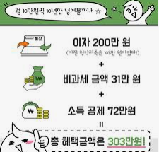 또한 청년 우대형 청약통장을 가입 기간 2년 이상 유지 시 원금의 연 600만원 한도로 이자소득 500만우너 까지 비과세 혜택이 있습니다.