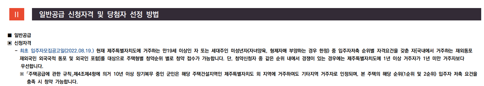 입주자모집공고일 현재 제주특별자치도에 거주하는 만19세 이상인 자 또는 세대주인 미성년자(자녀양육, 형제자매부양) 중 입주자저축 순위별 자격요건을 갖춘자(국내에서 거주하는 재외동포, 재외국민, 외국국적 동포 및 외국인 포함)를 대상으로 주택형별 청약순위 별로 청약 접수가 가능합니다. 단, 청약신청자 중 같은 순위 내에서 경쟁이 있느 ㄴ경우에는 제주특별자치도에 1년 이상 거주자가 1년 미만 거주자보다 우선합니다.