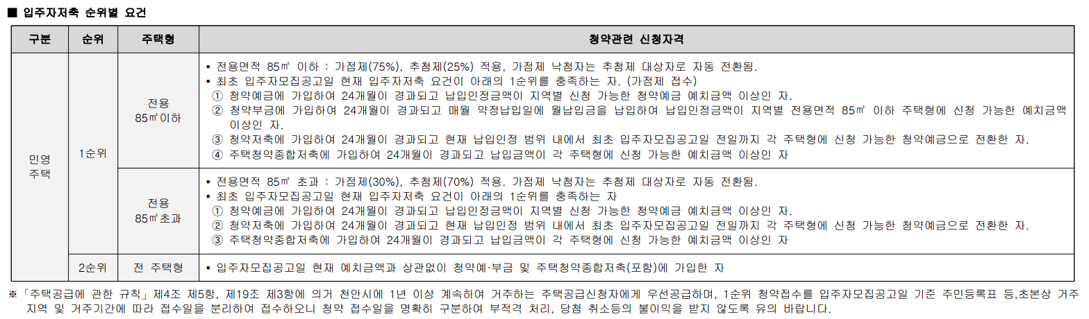 - 전용면적 85㎡이하 세대 : 가점제(75%) 적용, 추첨제(25%) 적용, 가점제 낙첨자는 추첨제 대상자로 자동 전환됩니다.