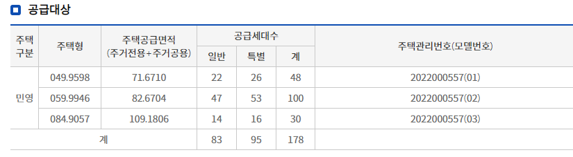 - 전용면적 85㎡이하 세대 : 가점제(100%) 적용. 가점제 낙첨자는 추첨제 대상자로 자동 전환됩니다.