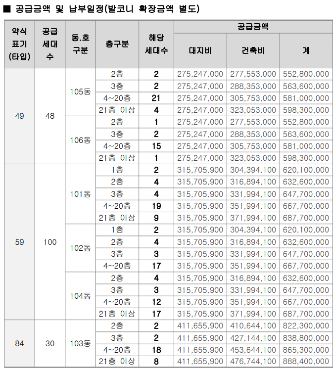 해당 표의 분양가는 최고가 기준임으로, 각 층별 평형별 자세한 분양가는 위 사진을 참고하시면 됩니다.
