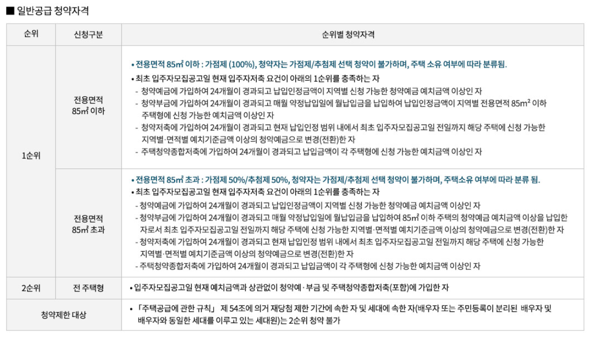 - 전용면적 85㎡이하 세대 : 가점제(100%) 적용