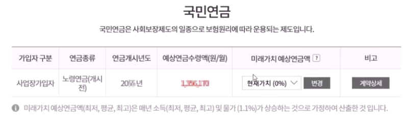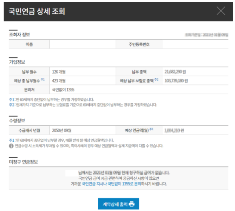 3영업일 후에 위 사진처럼 연금종류, 연금개시년도, 예상연금수령액(월단위)로 모든 국민연금에 관한 정보를 알아볼 수 있습니다.