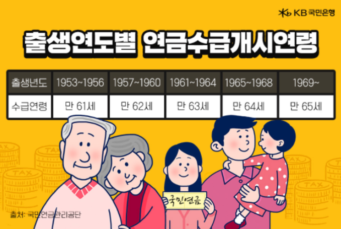 국민연금의 연금수급개시연령으로는 출생년도에 따라 조금 차이가 있습니다. 1953~1956년생은 만 61세부터 1957~1960년생은 만 62세 1961~1964년생은 만 63세 1965~1968년생은 만 64세 1969년생 이후부턴는 만 65세부터 국민연금을 수령할 수 있습니다.