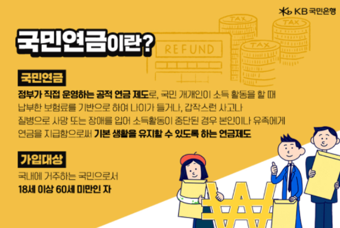 정부가 직접 운영하는 공적 연금 제도로, 국민 개개인이 소득 활동을 할 때 납부한 금액을 바탕으로 나이가 들거나, 갑작스런 사고나 질병으로 사망 또는 장애를 입어 소득 활동이 중단된 경우 본인이나 유족에게 연금을 지급함으로써 기본 생활을 유지할 수 있도록 하는 사회보장제도입니다.