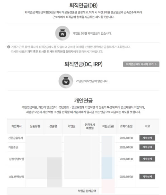 또한, 계약상세를 클릭하시면, 각 연금별 가입일, 현재 납부한 원금, 만기까지 납부했을 시 예상 적립금 등 더욱 세부적인 계약 내용을 확인할 수 있으며, 원하신다면 출력도 가능합니다.