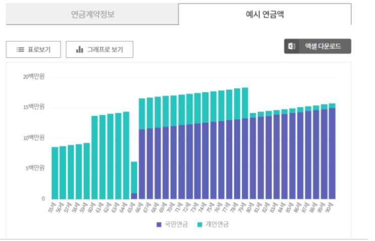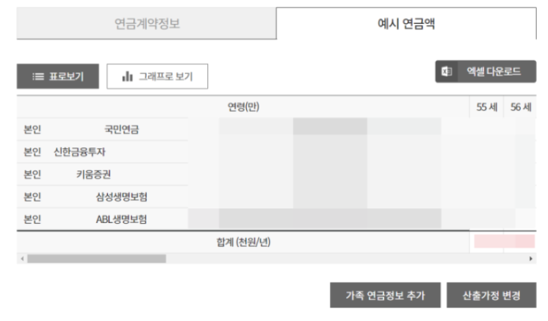 국민연금 이외에도 다양한 연금(개인연금, 퇴직연금) 등의 수령액도 조회할 수 있습니다. 현재의 연금계약정보를 한 눈에 쉽게 확인 가능하고, 1년에 얼마 정도 수령이 가능한지, 언제 수령할 수 있는지, 연도별 예상 수령액을 통해 전체 수령금액 등 세부 정보를 알 수 있습니다.