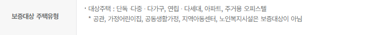 연립, 빌라, 다세대, 주거용 오피스텔, 아파트 등 임차 보증금이 수도권 5억 이하, 수도권 외 4억 이하여야 하며, 기관에 따라 아파트를 제외한 소유권 보전이 접수일로부터 1년이 경과하지 않는 등의 제한 상항이 있을 수 있습니다.