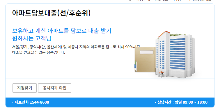- 자격조건 : 보유하고 계신 아파트를 담보로 대출 받기 원하시는 고객님