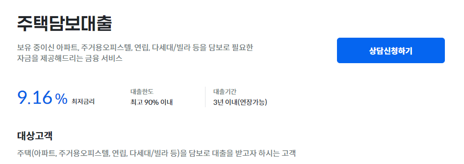 - 자격조건 : 주택(아파트,주거용오피스텔, 연립, 다세대/빌라 등)을 담보로 대출을 받고자 하는 고객