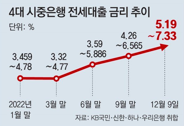 지난 10월 대비 2달사이 금리가 1%가까이 또 올랐습니다. 2030 전세대출을 받은 젊은 층들의 부담이 날이 갈수록 늘고 있는데요. 전세자금대출과는 다르게 주담대는 "특례보금자리론"을 출시하는등 소득 제한을 없애고 한도를 늘리는 등 혜택을 확대하고 있지만, 전세대출의 경우 정책 지원이 적고 조건이 까다롭다는 지적이 나오고 있습니다.